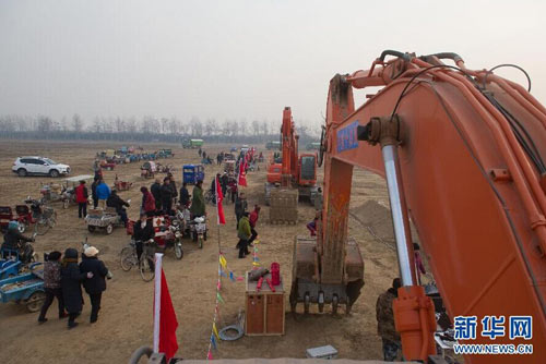 2014年12月26日,北京新机场工程正式开工建设。据介绍,首先破土动工的是北京新机场飞行区场道工程一标段,位于北京市提供的先行用地区域,主要包括西二跑道的一部分以及相关滑行道。新机场位于北京市大兴区榆垡镇、礼贤镇和河北廊坊市广阳区之间,定位为大型国际航空枢纽,规划建设7条跑道,满足年旅客吞吐量1亿人次需求。新华社记者 罗晓光 摄