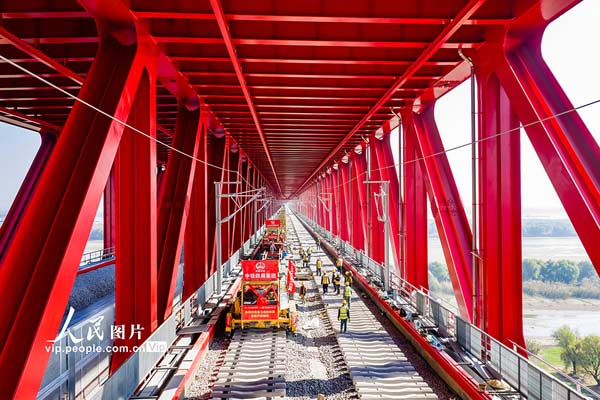 2025年12月3日,安徽马鞍山当涂县巢马城际铁路施工现场,国产WZ500型铺轨机将最后一对500米无缝钢轨铺设到位,标志着巢马城际铁路马鞍山长江公铁大桥主汊航道桥实现轨通,全线铺轨取得重大进展。