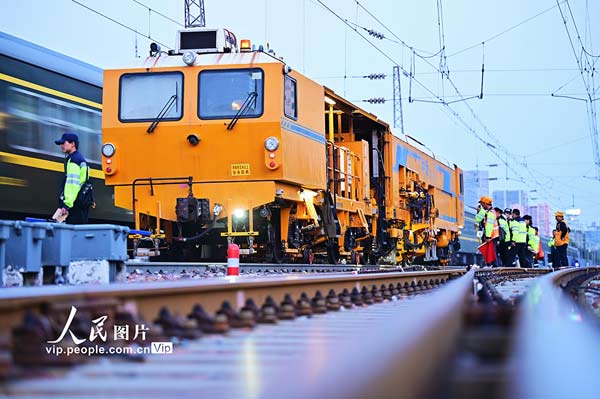2026年4月23日,河南郑州京广铁路海棠寺站,国铁集团郑州局运用大型养路机械,对站内道岔开展机械化捣固作业,持续提升京广铁路行车设备质量和列车通行效率,为即将到来的“五一”假期旅客运输筑牢安全屏障。